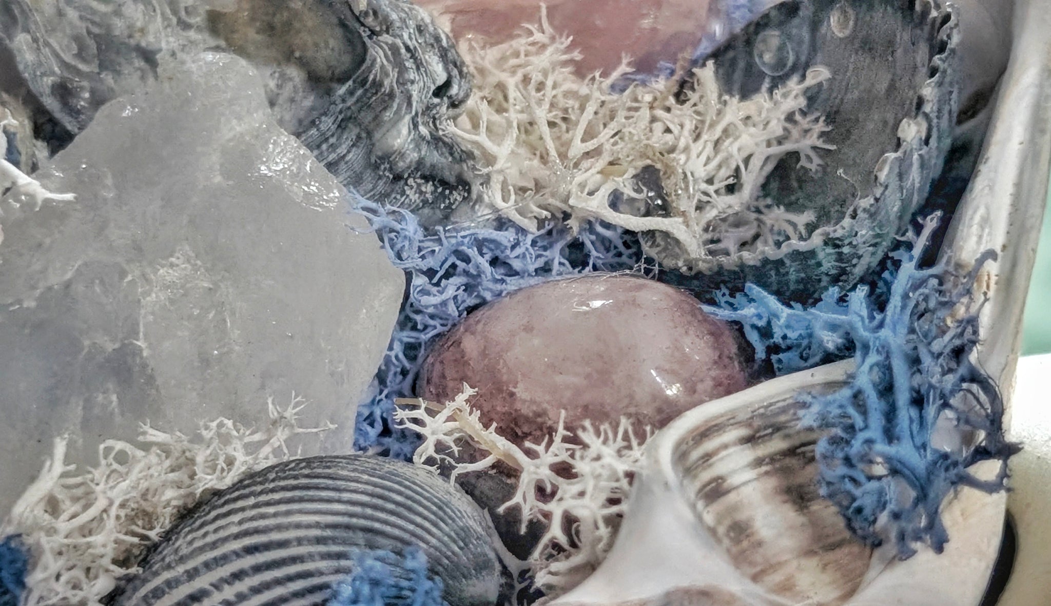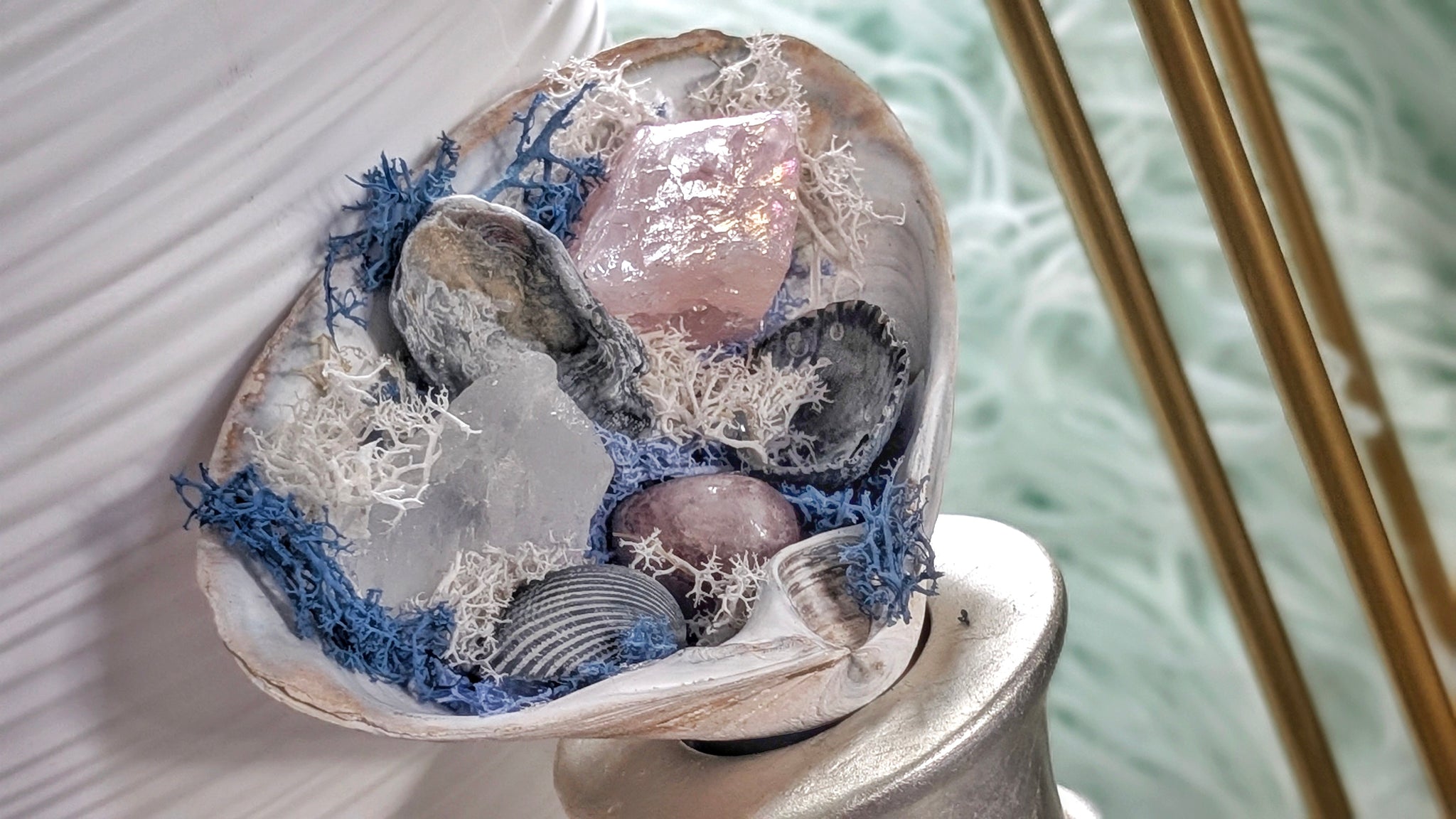 Angel Aura Crackle Quart Crystal & Artificial Moss in Seashell