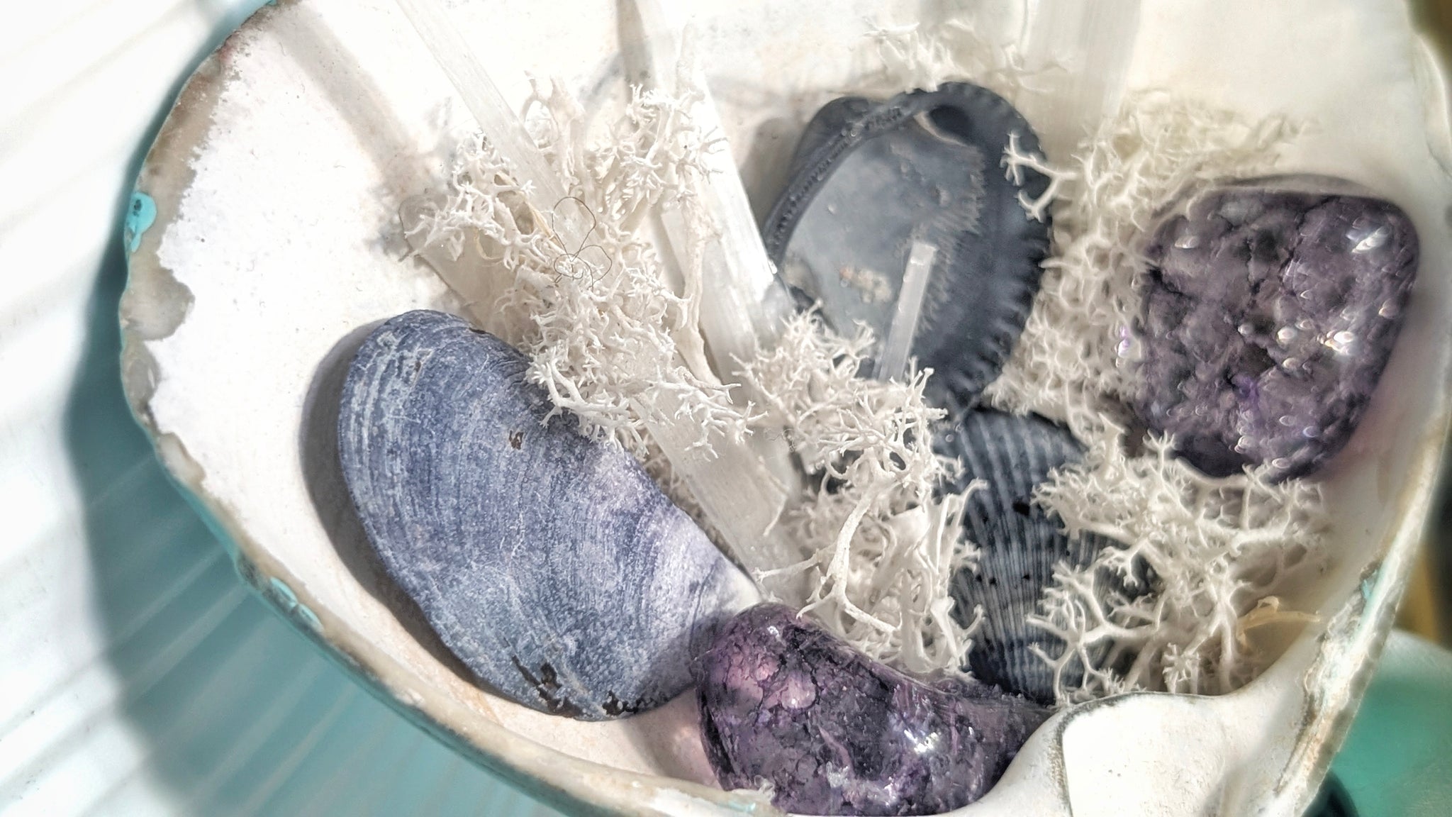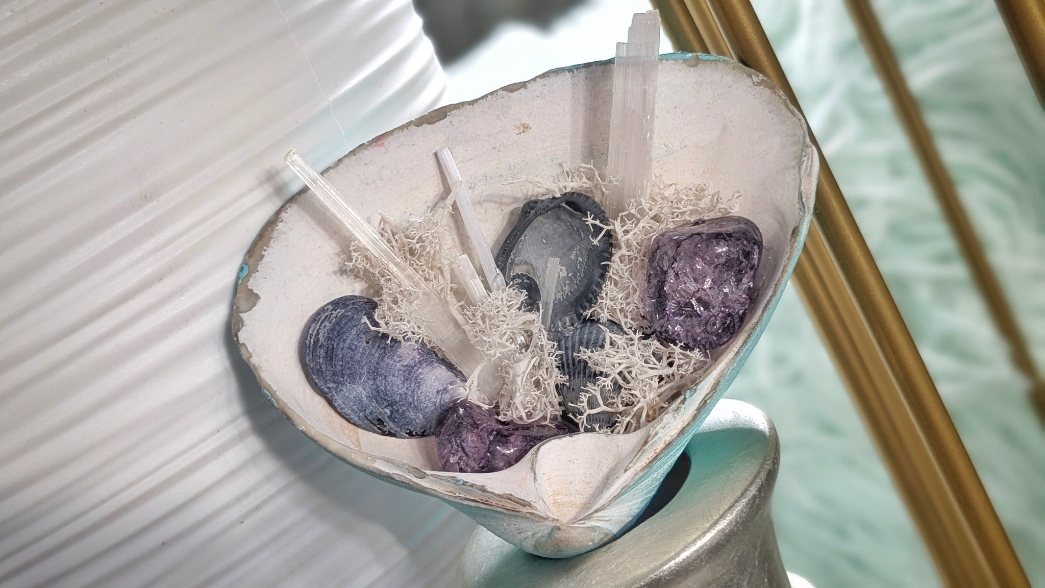 Crackle Quartz Selenite Artificial Moss in Seashell