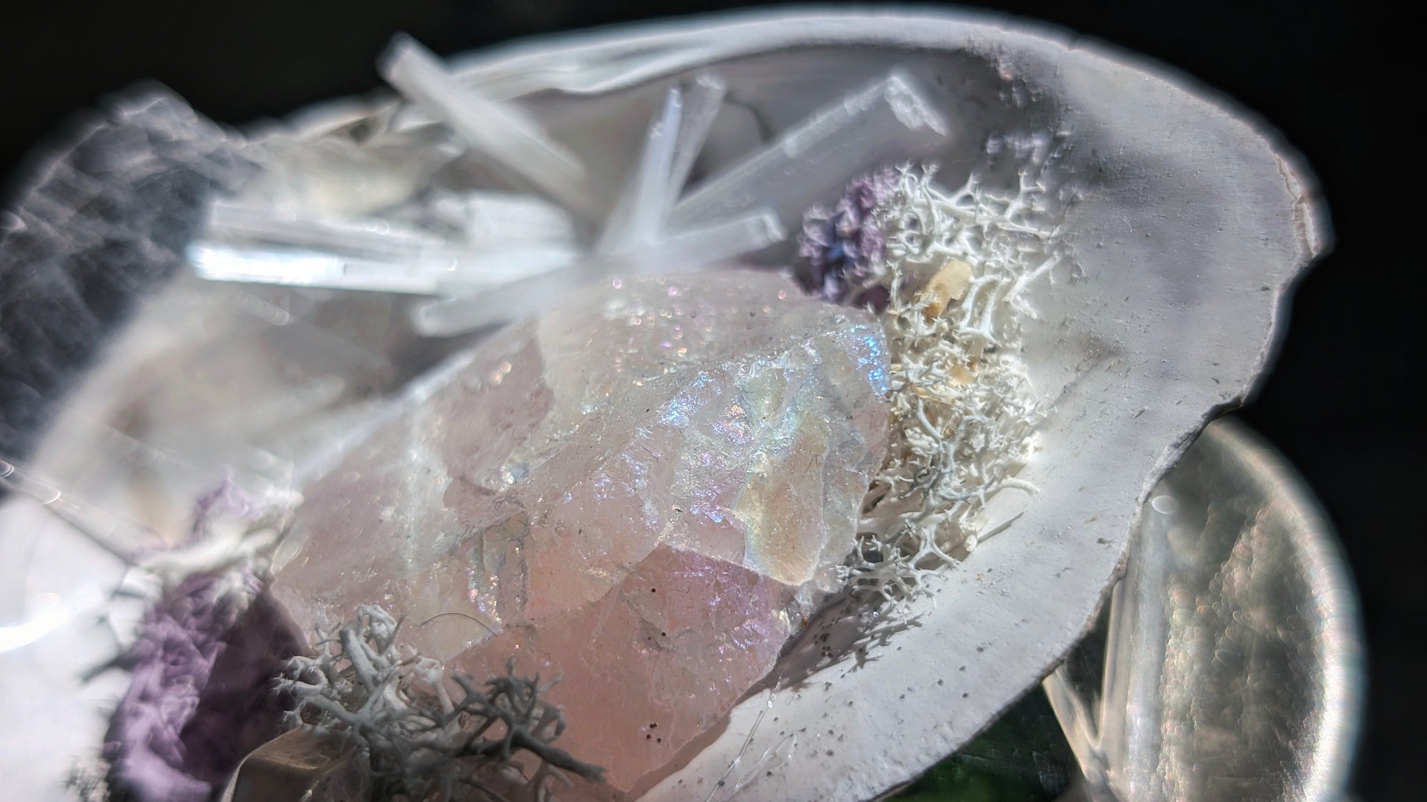 Angel Aura Quartz & Selenite Crystal & Artificial Moss in Seashell