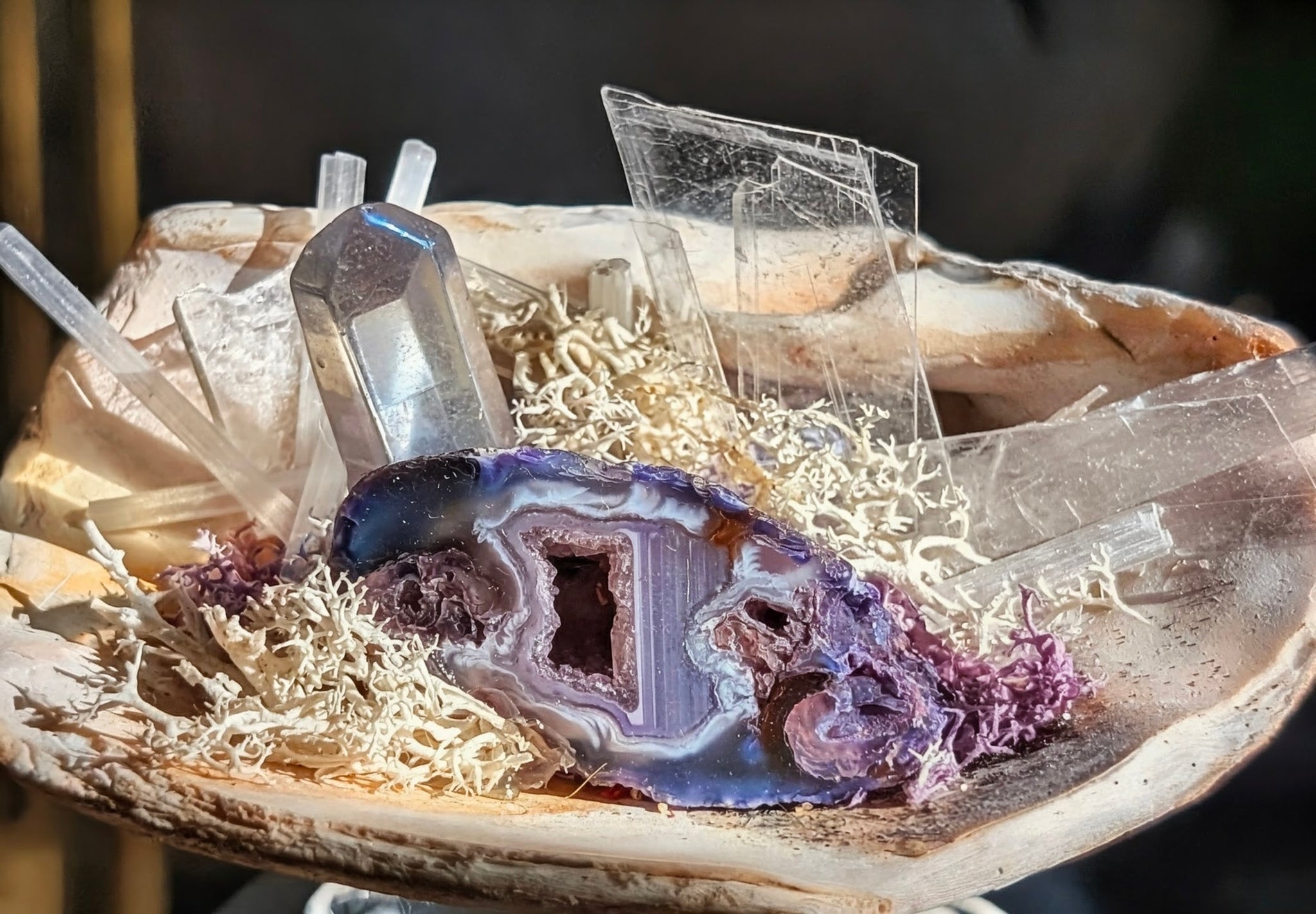 Selenite, Angel Aura & Druzy Occo Geode Agate Crystals in Moss Seashell