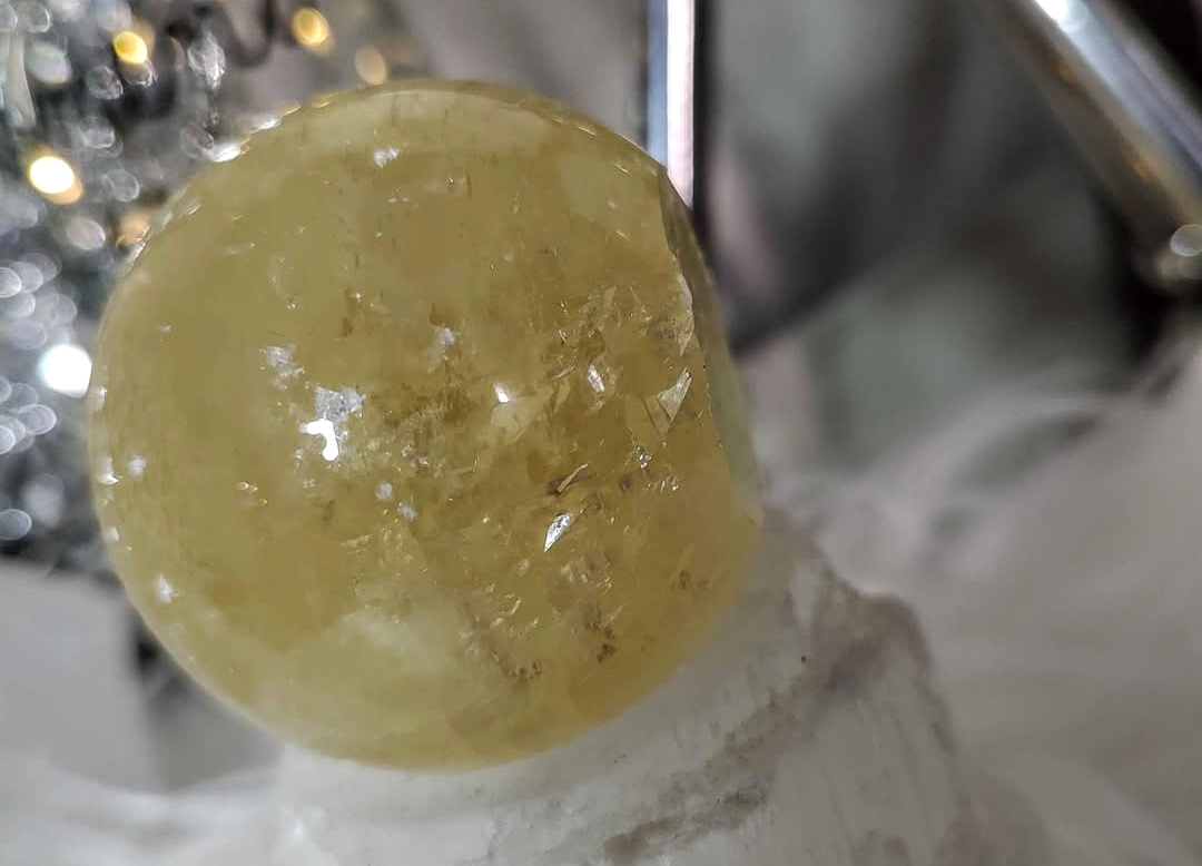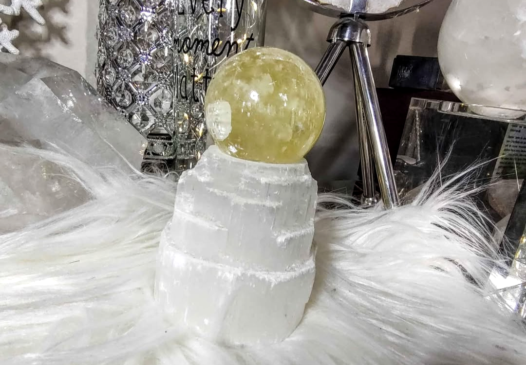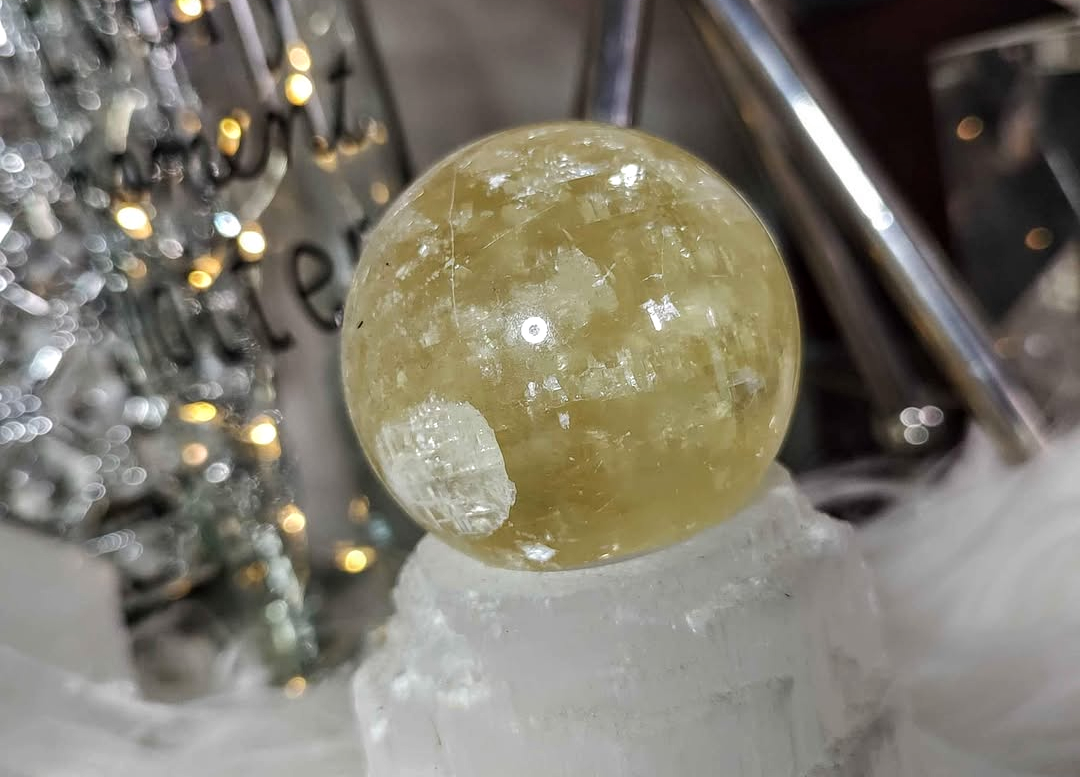 5" Flat Bottom Rainbow Honey Calcite Sphere on Selenite Stand